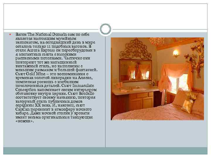 Вагон The National Domain сам по себе является настоящим музейным экспонатом, на сегодняшний день в мире осталось только 11 подобных вагонов. В отеле Aurora Express он переоборудован в 4 элегантных сьюта с высокими расписными потолками. Частично они повторяют тот же напыщенный винтажный стиль, но выполнены с меньшим размахом и большей фантазией. Сьют Gold Mine – это воспоминания о временах золотой лихорадки на Аляске, помпезная роскошь с изобилием позолоченных деталей. Сьют Immaculate Conception напоминает своим интерьером обстановку внутри церкви. Сьют Bordello соответствует своему названию, повторяя вычурный стиль публичных домов середины ХХ века. И, наконец, сьют Can переносит в атмосферу ночного кабаре. Даже ночной столик у кровати имеет весьма оригинальные танцующие «ножки» .