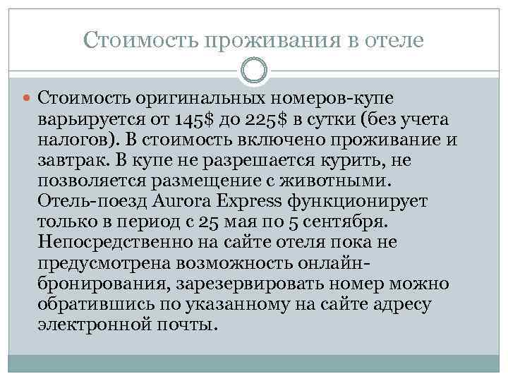 Стоимость проживания в отеле Стоимость оригинальных номеров-купе варьируется от 145$ до 225$ в сутки (без учета налогов). В стоимость включено проживание и завтрак. В купе не разрешается курить, не позволяется размещение с животными. Отель-поезд Aurora Express функционирует только в период с 25 мая по 5 сентября. Непосредственно на сайте отеля пока не предусмотрена возможность онлайнбронирования, зарезервировать номер можно обратившись по указанному на сайте адресу электронной почты.