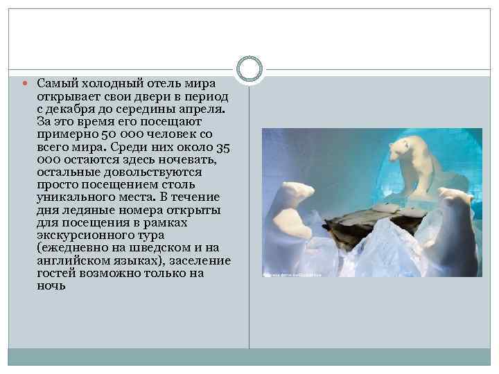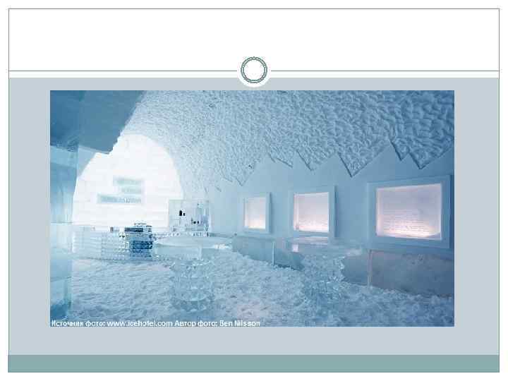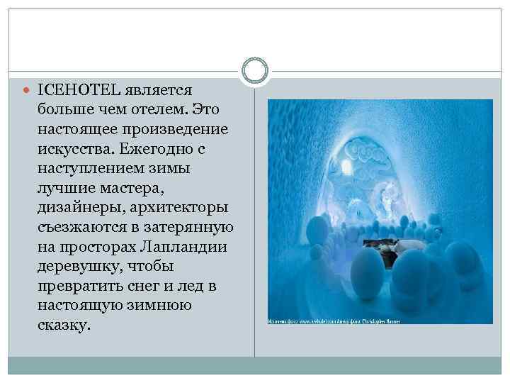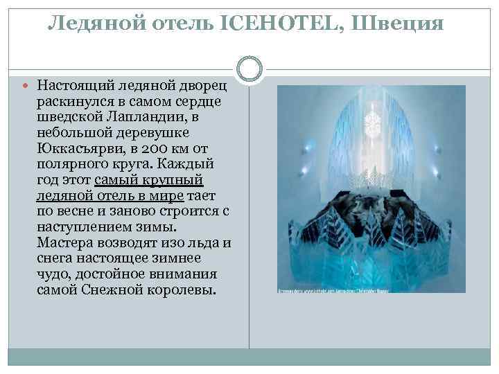 Ледяной отель ICEHOTEL, Швеция Настоящий ледяной дворец раскинулся в самом сердце шведской Лапландии, в небольшой деревушке Юккасъярви, в 200 км от полярного круга. Каждый год этот самый крупный ледяной отель в мире тает по весне и заново строится с наступлением зимы. Мастера возводят изо льда и снега настоящее зимнее чудо, достойное внимания самой Снежной королевы.