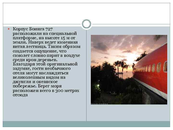 Корпус Боинга 727 расположили на специальной платформе, на высоте 15 м от земли. Наверх ведет каменная витая лестница. Таким образом создается ощущение, что самолет словно парит в воздухе среди крон деревьев. Благодаря этой оригинальной задумке, гости необычного отеля могут наслаждаться великолепным видом на джунгли и океанское побережье. Берег моря расположен всего в 300 метрах отсюда