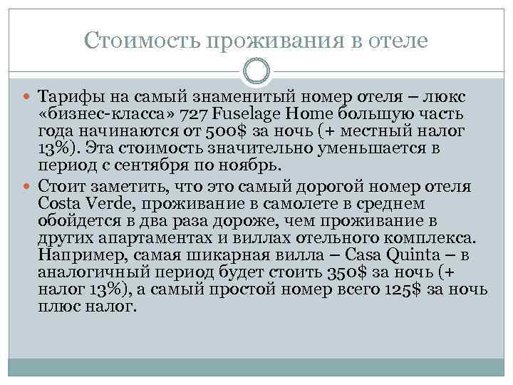 Стоимость проживания в отеле Тарифы на самый знаменитый номер отеля – люкс «бизнес-класса» 727 Fuselage Home большую часть года начинаются от 500$ за ночь (+ местный налог 13%). Эта стоимость значительно уменьшается в период с сентября по ноябрь. Стоит заметить, что это самый дорогой номер отеля Costa Verde, проживание в самолете в среднем обойдется в два раза дороже, чем проживание в других апартаментах и виллах отельного комплекса. Например, самая шикарная вилла – Casa Quinta – в аналогичный период будет стоить 350$ за ночь (+ налог 13%), а самый простой номер всего 125$ за ночь плюс налог.