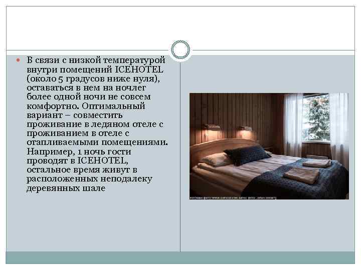В связи с низкой температурой внутри помещений ICEHOTEL (около 5 градусов ниже нуля), оставаться в нем на ночлег более одной ночи не совсем комфортно. Оптимальный вариант – совместить проживание в ледяном отеле с проживанием в отеле с отапливаемыми помещениями. Например, 1 ночь гости проводят в ICEHOTEL, остальное время живут в расположенных неподалеку деревянных шале