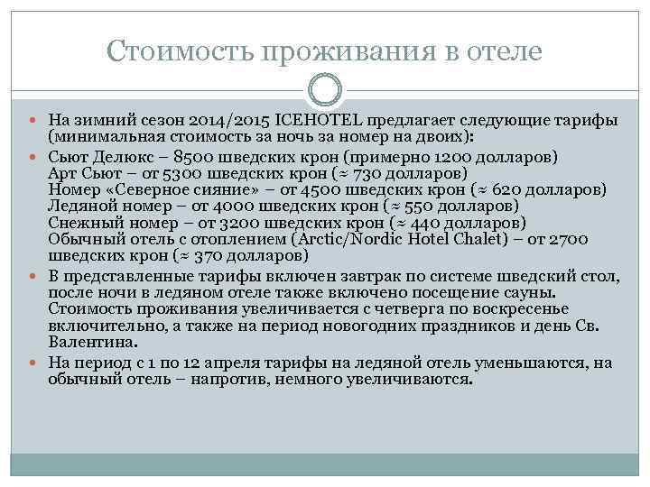 Стоимость проживания в отеле На зимний сезон 2014/2015 ICEHOTEL предлагает следующие тарифы (минимальная стоимость за ночь за номер на двоих): Сьют Делюкс – 8500 шведских крон (примерно 1200 долларов) Арт Сьют – от 5300 шведских крон (≈ 730 долларов) Номер «Северное сияние» – от 4500 шведских крон (≈ 620 долларов) Ледяной номер – от 4000 шведских крон (≈ 550 долларов) Снежный номер – от 3200 шведских крон (≈ 440 долларов) Обычный отель с отоплением (Arctic/Nordic Hotel Chalet) – от 2700 шведских крон (≈ 370 долларов) В представленные тарифы включен завтрак по системе шведский стол, после ночи в ледяном отеле также включено посещение сауны. Стоимость проживания увеличивается с четверга по воскресенье включительно, а также на период новогодних праздников и день Св. Валентина. На период с 1 по 12 апреля тарифы на ледяной отель уменьшаются, на обычный отель – напротив, немного увеличиваются.
