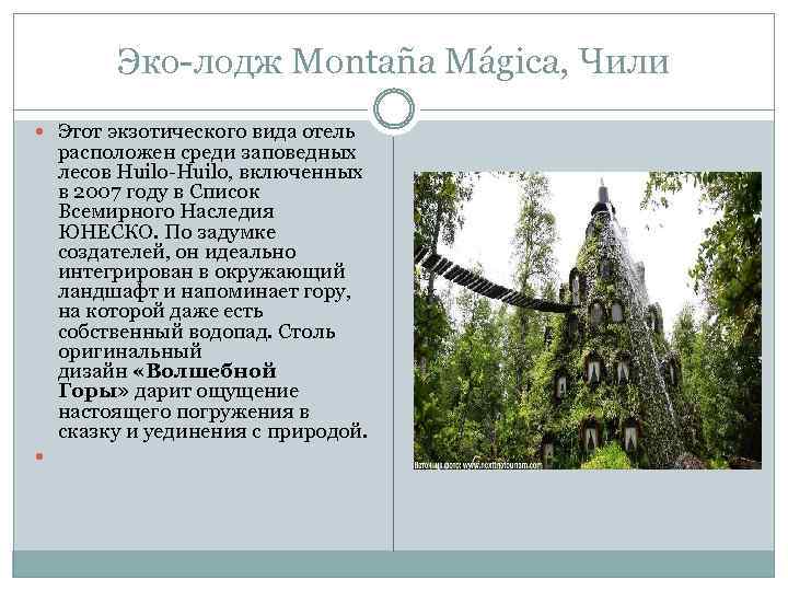 Эко-лодж Montaña Mágica, Чили Этот экзотического вида отель расположен среди заповедных лесов Huilo-Huilo, включенных в 2007 году в Список Всемирного Наследия ЮНЕСКО. По задумке создателей, он идеально интегрирован в окружающий ландшафт и напоминает гору, на которой даже есть собственный водопад. Столь оригинальный дизайн «Волшебной Горы» дарит ощущение настоящего погружения в сказку и уединения с природой.