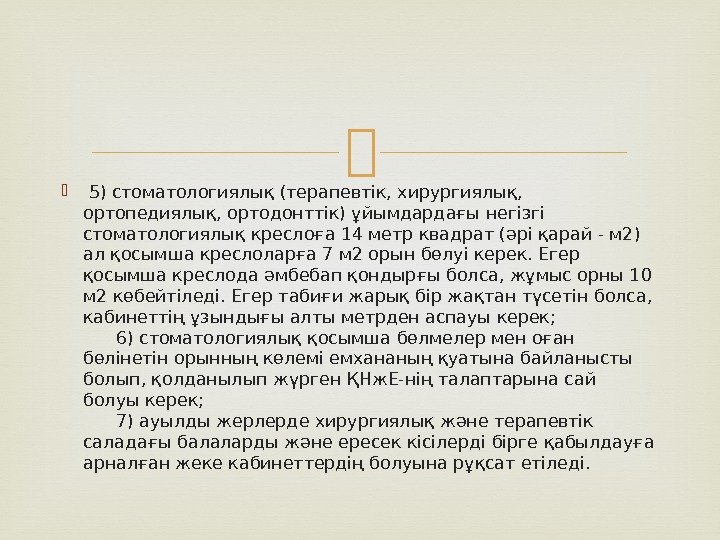 5) стоматологиялық (терапевтiк, хирургиялық, ортопедиялық, ортодонттік) ұйымдардағы негiзгi стоматологиялық креслоға 14 метр квадрат (әрi қарай — м 2) ал қосымша креслоларға 7 м 2 орын бөлуi керек. Егер қосымша креслода әмбебап қондырғы болса, жұмыс орны 10 м 2 көбейтiледi. Егер табиғи жарық бiр жақтан түсетiн болса, кабинеттiң ұзындығы алты метрден аспауы керек; 6) стоматологиялық қосымша бөлмелер мен оған бөлiнетiн орынның көлемi емхананың қуатына байланысты болып, қолданылып жүрген ҚНж. Е-нiң талаптарына сай болуы керек; 7) ауылды жерлерде хирургиялық және терапевтiк саладағы балаларды және ересек кiсiлердi бiрге қабылдауға арналған жеке кабинеттердiң болуына рұқсат етiледi.