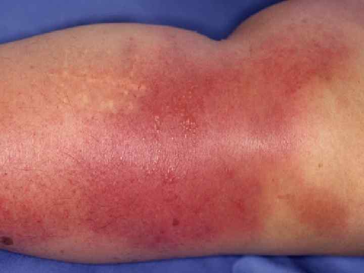 Гиперемия яркая, имеет четкие границы со здоровой кожей, по периферии определяется валик, края участка неровные, напоминают очертания географической карты Воспаленный участок возвышается над уровнем здоровой кожи, на ощупь горячий, слегка болезненный