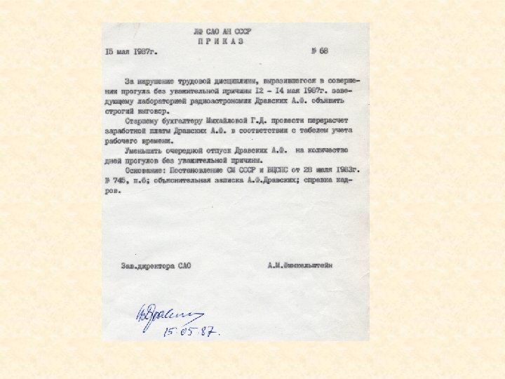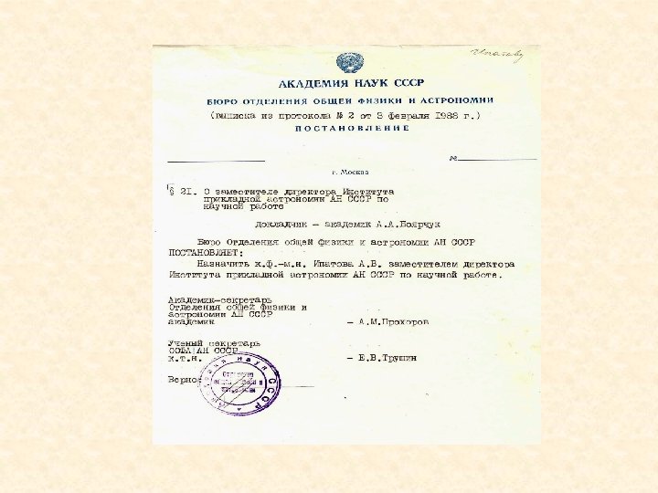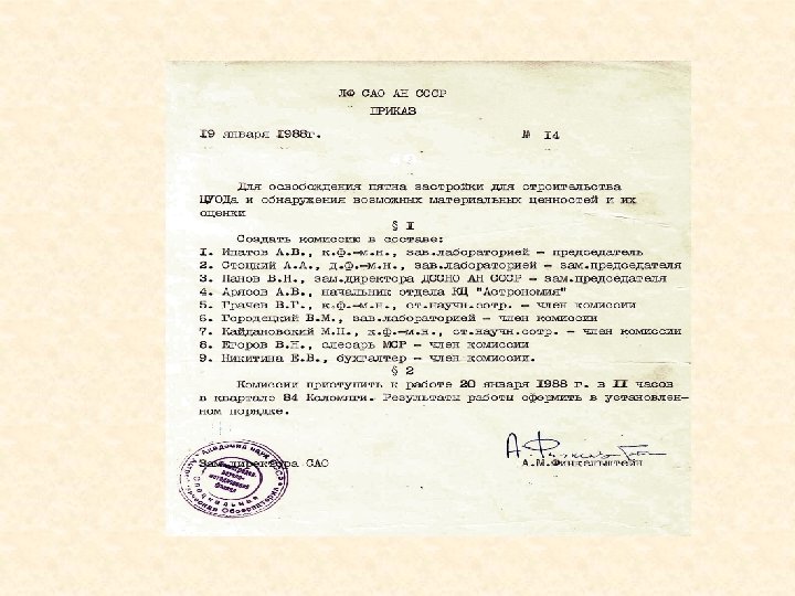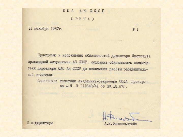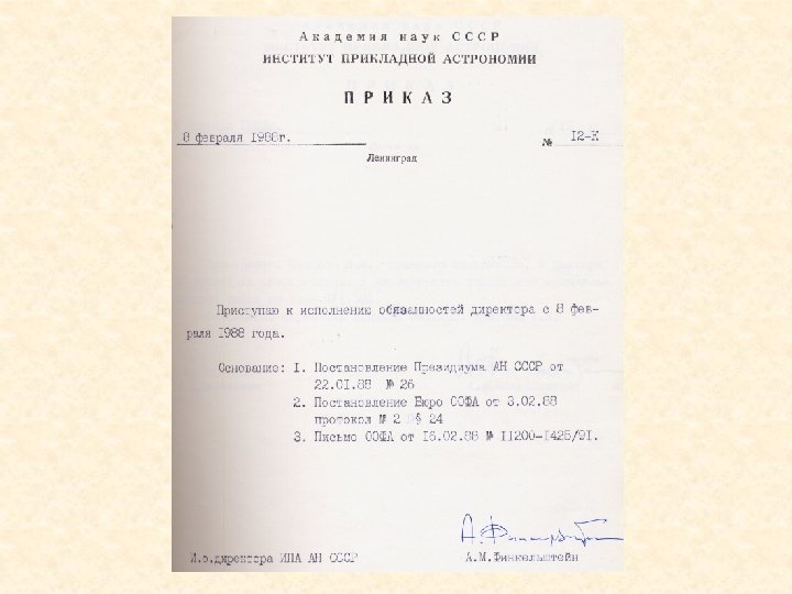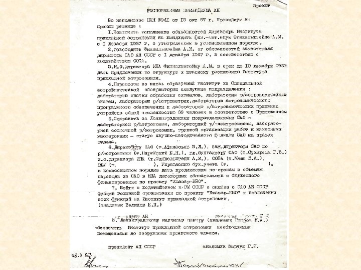 24. 12. 1985 г. Распоряжение Е. П. Велихова: • назначить академика АН УССР Я. С. Яцкива научным руководителем проекта «Квазар-КВО» ; • назначить Члена корреспондента АН СССР М. Л. Александрова Главным конструктором комплекса «Квазар-КВО» ; • ввести в САО АН СССР должность заместителя директора по научной работе; • назначить канд. физ. -мат. наук А. М. Финкельштейна Вр. ИО заместителя директора по научной работе с утверждением в установленном порядке; • перевести сектор радиоастрометрии ГАО АН СССР в САО АН СССР (12 человек).