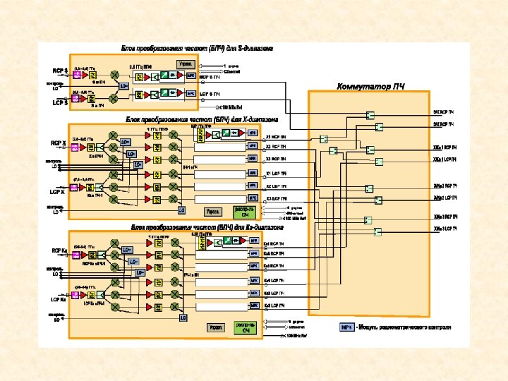Приемная система радиотелескопа S X Ka 2, 2 -2, 6 7, 0 -9, 5 28 -36 15 15 30 90 (60) Неравномерность коэффициента усиления, не более д. Б 1. 5 Подавление зеркального канала, не менее, д. Б 70 70 70 нет 1024 -1536 1024‑ 2048 1024 -1536 Рабочий диапазон частот, ГГц ЭШТВ, К Коэффициент усиления, д. Б Полоса ПЧ по уровню – 6 д. Б, МГц широкая узкая