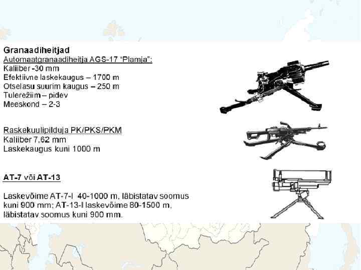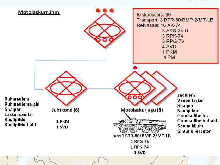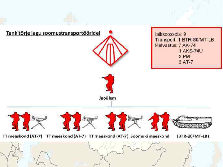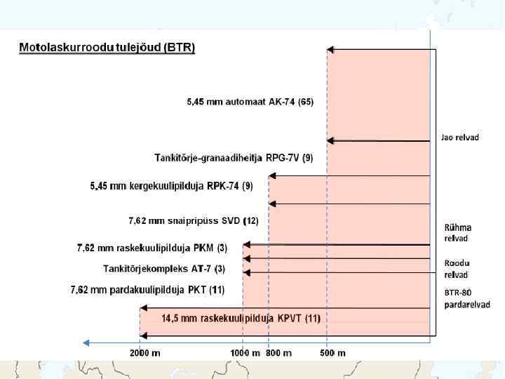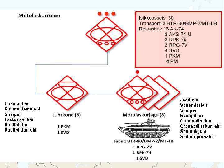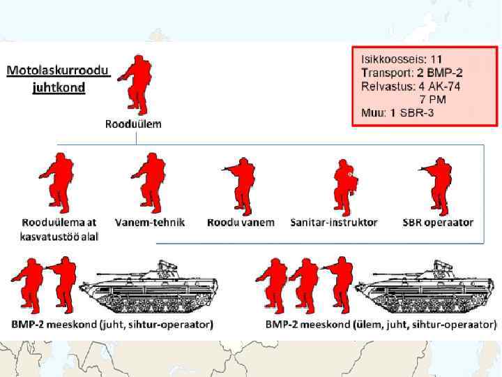 BMD-2 Meeskond: 2 + 5 Kaal: 13 200 kg Kiirus: 70 km/h, vees 10 km/h Relvastus: 1 x 30 mm automaatkahur 1 x 7, 62 mm kuulipilduja 2 x 3 81 mm suitsugranaadiheitja Lahingukomplekt: 300 - 30 mm granaati 4 - JTTR 2940 - 7, 62 mm padrunit