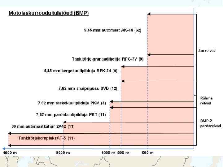 BMD-1 Meeskond: 2 + 5 Kaal: 13 200 kg Kiirus: 70 km/h, vees 10 km/h Relvastus: 1 x 73 mm kahur 1 x 7, 62 mm kuulipilduja 2 x 3 81 mm suitsugranaadiheitja Lahingukomplekt: 40 - 73 mm mürsku 4 - JTTR 2000 - 7, 62 mm padrunit