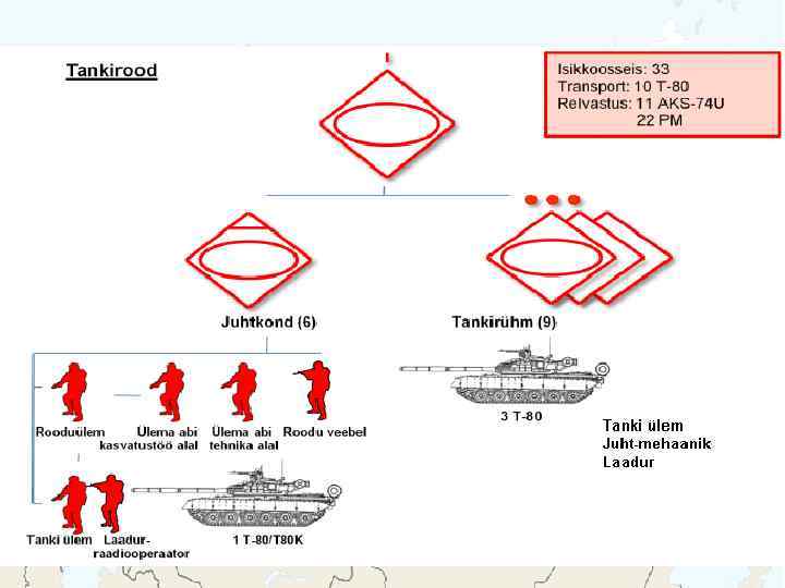 T-80 Meeskond: 3 Kaal: 46 000 kg Kiirus: 70 km/h, maastikul 50 km/h Relvastus: 1 x 125 mm kahur 1 x 7, 62 mm kuulipilduja 1 x 12, 7 mm õhutõrje kuulipilduja 8 suitsugranaadiheitjat Lahingukomplekt: 39 - 125 mm mürsku 1250 - 7, 62 mm padrunit 450 - 12, 7 mm padrunit 4 - JTTR