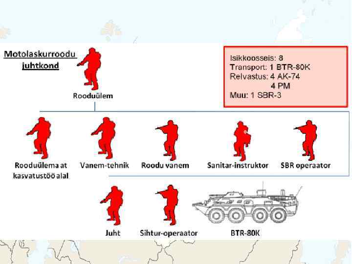 BTR-80 A BTR-80 Meeskond: 3 + 7 Kaal: 13 600 kg Kiirus: 80 km/h, vees 9 km/h Relvastus: 1 x 14, 5 mm kuulipilduja 1 x 7, 62 mm kuulipilduja Lahingukomplekt: 500 - 14, 5 mm padrunit 2000 - 7, 62 mm padrunit