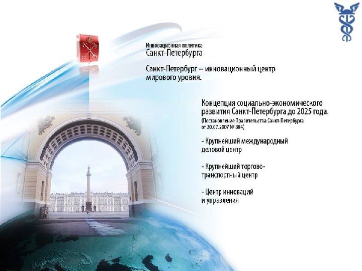Saint Petersburg innovation policy Saint Petersburg – international level innovation center Saint Petersburg social and economic development till 2025 (Saint Petersburg government regulation No. 884 dated 20. 07. 2007) - the largest international business center - the largest commercial and transport center - innovation and administration center