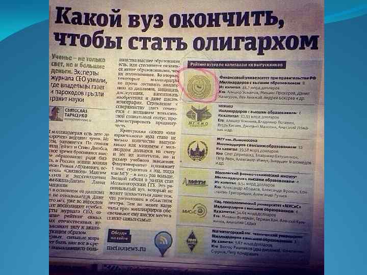 Журнал «Форбс» составил список учебных заведений, из которых вышло самое большое количество выпускников, попавших в список наиболее состоятельных людей мира: Выпускники Их совокупное Высшее учебное заведение из списка состояние: Forbes 4. Московский государственный университет 1. Московский государственный институт международных отношений 2. Финансовый университет при правительстве РФ 18 9 8 Наиболее известные выпускники Олег Дерипаска, Владимир Евтушенков, Петр $36 млрд Авен, Александр Мамут, Юрий Мильнер Алишер Усманов, $41, 45 млрд Владимир Потанин, Александр Лебедев Алишер Усманов, $40, 8 млрд Михаил Прохоров, Андрей Бородин