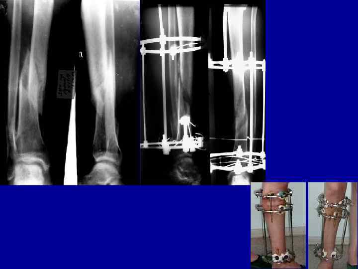 ПРЕИМУЩЕСТВА МЕТОДА ВНЕШНЕЙ ФИКСАЦИИ 1. Относительная малотравматичность 2. Отсутствие дополнительной интраоперационной кровопотери, нередкий противошоковый эффект 3. Высокая функциональная стабильность фиксации отломков 4. Возможность применения при наличии раневой инфекции или при высоком риске ее развития, в первую очередь, при огнестрельных переломах 5. Возможность постепенной репозиции отломков, в том числе коррекции застарелых и ригидных многоплоскостных деформаций 6. Возможность восполнения обширных дефектов кости методом несвободной костной пластики по Илизарову
