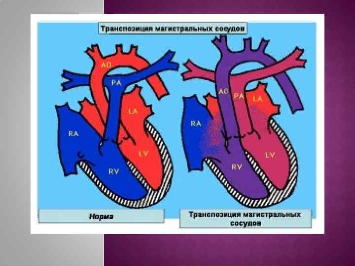Клиника: -одышка -выраженный (синий) цианоз -тахикардия Шум может быть при сопутствующем стенозе ЛА. Закрытие ОАП ведет к прогрессирующему ухудшению состояния (дуктус – зависимый легочный кровоток). Терапия: введение простагландинов, процедура Рашкинда (закрытая атриосептостомия) с помощью специального баллона. Оперативное вмешательство: Артериальное переключение (в качестве системного используется левый желудочек)