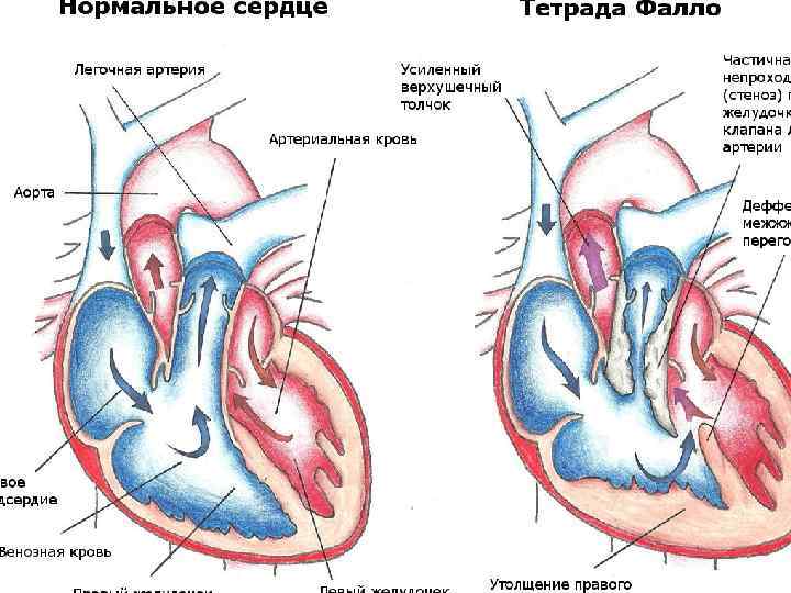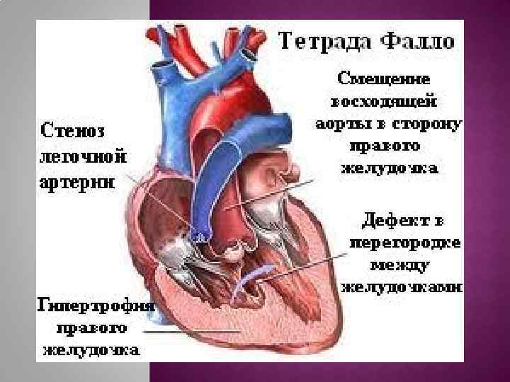 • Цианотические, проявляющиеся в основном артериальной гипоксемией: Разобщение большого и малого круга кровообращения, шунт крови справа налево, уменьшение легочного кровотока. Некоторые сочетаются с СН. -ТМС -Тетрада Фалло -Атрезия легочной артерии -Аномалия Эбштейна