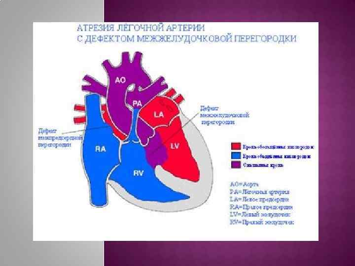 1) Атрезия ЛА + ДМЖП 2) Атрезия ЛА с ИМЖП 3) Атрезия ЛА + другие пороки Гемодинамика: Атрезия ЛА +ДМЖП: Кровь из ПЖ чз ДМЖП и ЛЖ поступает в Ао. Гипоксемия обратно пропорциональна легочному кровотоку (диаметру ОАП и БАЛК). Смертность 25% в 1 -й год жизни, 22% в течение следующих 5 -ти лет Клиника: цианоз (дуктус-зависимое легочное кровообращение). Обследование: Ангио КТ (источники кровоснабжения легких) Оперативное вмешательство: палиатив; подключичнолегочный анастамоз. Радикальная операция в старшем возрасте