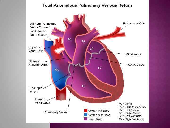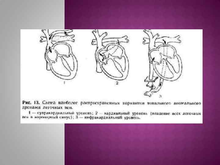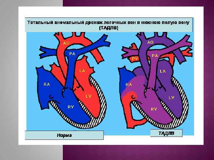 3% от всех ВПС Имеет несколько анатомических вариантов (Легочные вены впадают в правое предсердие, полые вены или коронарный синус). В чистом виде порок не совместим с жизнью. Жизнь возможна только при сопутствующем ДМЖП или ДМПП (кровь должна попасть в артериальное русло). Единственный порок сердца, требующий немедленного оперативного вмешательства. Значительная часть артериальной крови из легочных вен поступает не в левое предсердие, а в правое, затем чз правый желудочек снова в малый круг, то большая часть крови циркулирует в пределах малого круга, в большом круге гиповолемия.