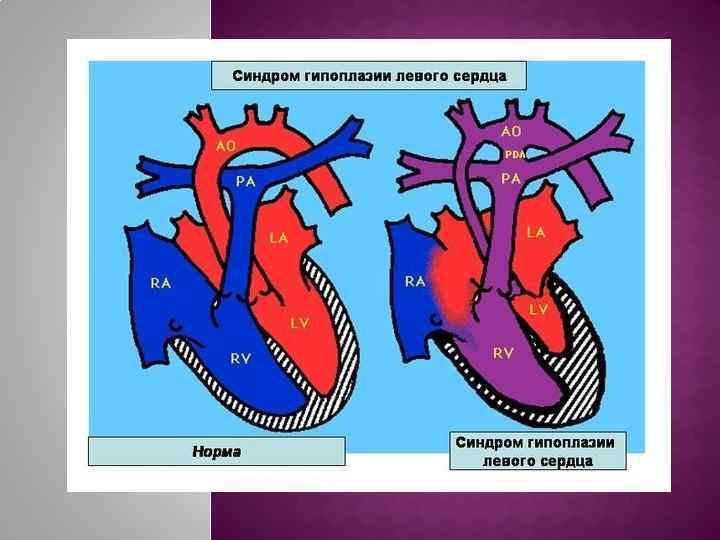 Относится к редким порокам, но является самой частой причиной смерти от ВПС. Анатомически заключается в недоразвитии ЛЖ, ЛП, в сочетании со стенозом или атрезией МК и гипоплазией восходящей Ао. Кровь из легочных вен притекает к ЛП, далее чз ООО или ДМПП в ПП, смешивается с венозной кровью из большого круга. Далее в ЛА, при наличии ДМЖП в маленький ЛЖ, гипоплазированную Ао. (+ функционирует ОАП) Неадекватное кровообращение в большом круге, гипертензия в малом круге. Клиника: катастрофически развивается НК, чаще ко 2 -м суткам после рождения. Первые признаки напоминают РДС, перинатальное поражение ЦНС и шок (выраженная одышка, тахикардия, гепатомегалия, могут быть отеки, снижение АД, Sp. O 2) Прогноз плохой: 80% умирают на 1 -й неделе жизни. Операция –паллиатив. Подготовка: ИВЛ воздухом, ПГЕ