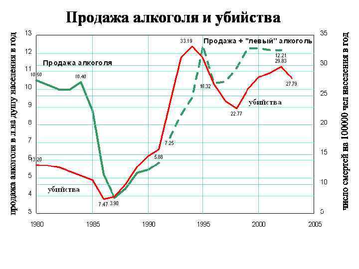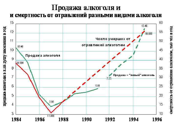 Зависимость смертности от количества употребления алкоголя в России 1 – начало антиалкогольной кампании; 2 – начало рыночных реформ; а – линия регрессии для 1965 — 1984; б – для 1986 — 1991. Общее количество смертей в России в 1965 — 2000 гг. Заметное снижение смертности началось уже через 2 -3 месяца после начала кампании, а очевидное — через полтора года: на 203, 5 тысячи или на 12, 3 % (1986 г. ) от общего числа смертей в 1984 г. За это время среднедушевое потребление алкоголя снизилось на 3, 7 литра, при том, что зависимость смертности от потребления была строго линейной в 1984 — 1986 гг.