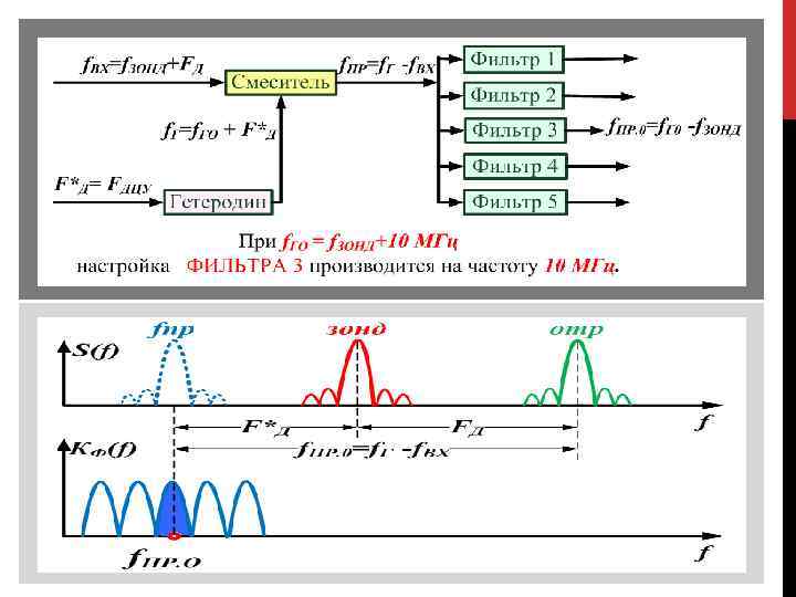 Решение проблемы обнаружения сигнала при полном отсутствии информации о цели обеспечивается за счет использования в качестве зондирующего сигнала пачки импульсов с низкой частотой повторения F*ПОВТ. При этом диапазон однозначного измерения скорости сокращается в N/n раз, но зато при любом значении FД в полосу пропускания гребенки из n фильтров попадает один из лепестков спектра отраженного от цели сигнала. Чтобы исключить возможность попадания в фильтры сигналов для которых FД=0 (пассивных помех), частота сигнала гетеродина f. Г=f. ГО±F*Д в устанавливается такой, чтобы лепестки спектра пассивной помехи находились за пределами суммарной полосы пропускания гребенки фильтров.