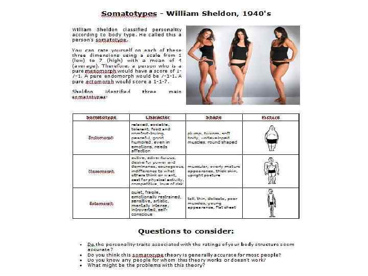 Система соматотипов У. Шелдона В основе представлений Шелдона, чья конституциональная типология близка к концепции Кречмера, лежит предположение о том, что структура тела определяет темперамент, выступающий его функцией. Но эта зависимость замаскирована благодаря сложности нашего организма и психики, и потому раскрыть связь между физическим и психическим возможно при выделении таких физических и психических свойств, которые в наибольшей степени демонстрируют подобную зависимость. Уильям Герберт Шелдон 1898 - 1977 У. Шелдон исходил из гипотезы о существовании основных типов телосложения, которые он описал, пользуясь специально разработанной фотографической техникой и сложными антропометрическими измерениями. Оценивая каждое из 17 выделенных им измерений по 7 -балльной шкале, автор пришел к понятию соматотипа (типа телосложения), который можно описать с помощью трех основных параметров. Заимствуя термины из эмбриологии, он назвал данные параметры следующим образом: эндоморфия, мезоморфия и эктоморфия. В зависимости от преобладания какого-либо из них (оценка в 1 балл соответствует минимальной интенсивности, 7 баллов - максимальной). Источник: http: //psychojournal. ru/psychologists/602 -uilyamsheldon-konstitucionalnaya-teoriya-temperamenta. html#t 20 c