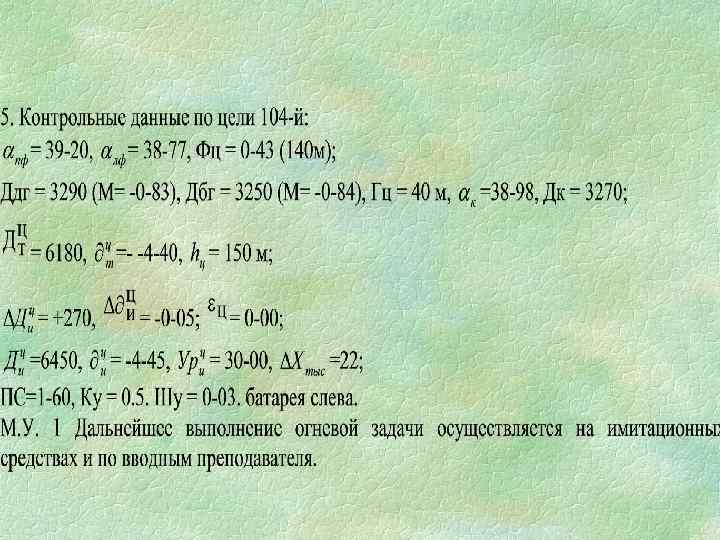 В батарее шесть орудий, основное - третье. Наименьшие дальности стрельбы вправо 800 м, прямо 650 м, влево 1200 м. На огневой позиции снаряды ОФ-25, заряды Полный с партией 8 -78 -562, 3 с партией 9 -79 -215. Суммарные отклонения начальной скорости снарядов для зарядов полного - +0, 35%Vо, третьего - +0, 55 %Vо. Температура зарядов (указывает преподаватель). В должности старшего офицера батареи подготовить доклад на ПУОД и командиру батареи (РБР ОПА ст. 44). В должности командира батареи подготовьте доклад.