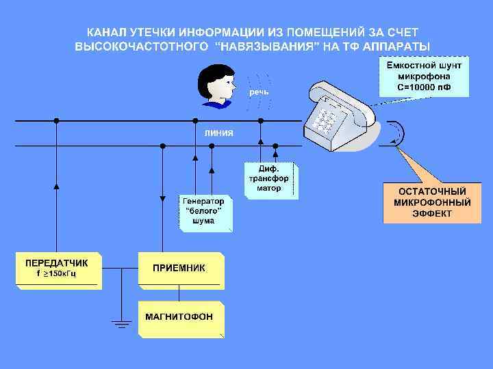 Активное воздействие на каналы утечки • пространственное и линейное зашумление, создаваемое генераторами электромагнитного и электрического шума • создание прицельных помех, генерируемых на рабочих частотах радиоканалов подслушивающих устройств • создание акустических и вибрационных помех, генерируемых системами вибрационной и акустической защиты • подавление диктофонов устройствами направленного высокочастотного радиоизлучения