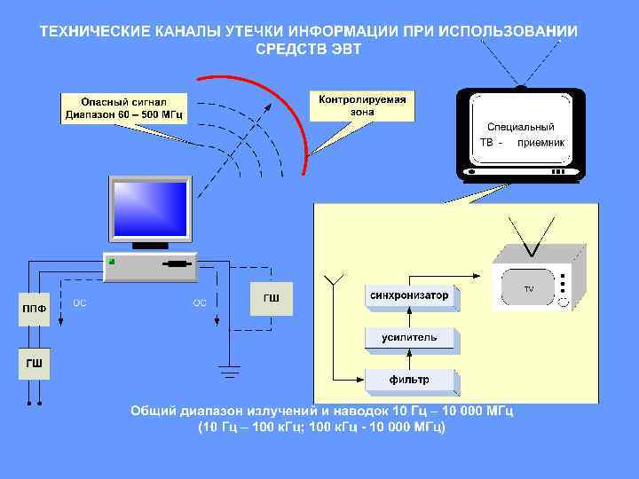 Технические каналы утечки информации за счёт ПЭМИН и возможности аппаратуры перехвата Тех. канал утечки информации Наименование аппаратуры Вид аппаратуры Технические дальности перехвата ПЭМИН Программно-аппаратные комплексы, портативные сканерные приёмники, цифровые анализаторы спектра, селективные микровольтметры Стационарная, портативная носимая, портативная возимая и автономная автоматическая до 1000 м Наводки информативного сигнала на цепи электропитания и линии связи Токосъёмники Портативная носимая, портативная возимая и автономная автоматическая до 300 м. Радиоизлучения, модулированные информативным сигналом Программно-аппаратные комплексы, портативные сканерные приёмники, цифровые анализаторы спектра, селективные микровольтметры Стационарная, портативная носимая, портативная возимая и автономная автоматическая до 1000 м. Радиоизлучения, формируемые в результате высокочастотного облучения технических средств обработки информации Программно-аппаратные комплексы, портативные сканерные приёмники, цифровые анализаторы спектра, селективные микровольтметры Стационарная, портативная носимая, портативная возимая и автономная автоматическая до 1000 м.