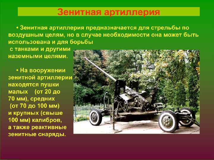§ 1. JPG По месту действия и характеру целей Нарезная артиллерия Противотанковая артиллерия Авиационная артиллерия Горная артиллерия Береговая артиллерия Корабельная артиллерия Зенитная артиллерия
