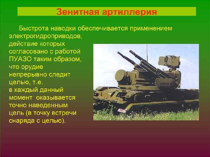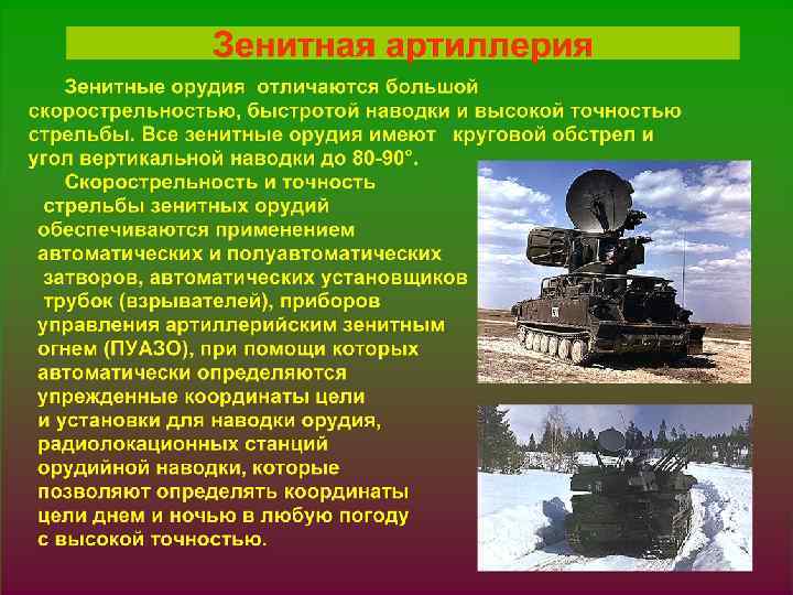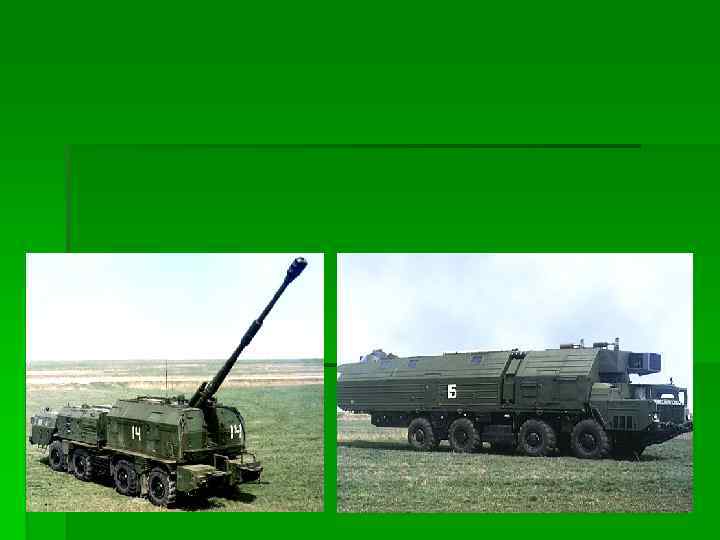 Самоходная артиллерия § Самоходными артиллерийскими установками (САУ) называются бронированные артиллерийские установки на шасси танка или автомобиля. САУ обладают высокой маневренностью и мощным артиллерийским и стрелковым вооружением, средствами для борьбы с воздушными 152 -мм самоходная артиллерийская целями. установка 2 С 19 на огневой позиции § С АУ служат для уничтожения живой силы, танков, самоходных орудий, огневых точек и других целей. Они могут вести огонь как с открытой, так и с закрытой огневой позиции.