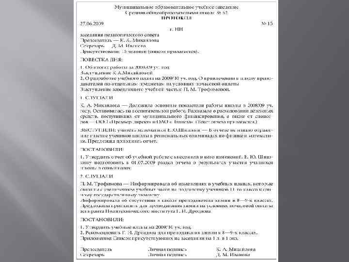 Протокол. Протокол – документ, содержащий последовательную запись хода обсуждения вопросов и принятия решений на собраниях, совещаниях, конференциях и заседаниях коллегиальных органов. Протокол отражает деятельность по совместному принятию решений коллегиальным органом или группой работников. От протоколов заседаний, создаваемых в управленческой деятельности организаций, следует отличать протоколы следственных, некоторых административных органов и органов охраны общественного порядка (например, протокол санитарного инспектора, протокол дорожнотранспортного происшествия и др. ), а также протоколы договорного типа (протоколы разногласий, протоколы согласования цены и др. ).