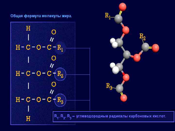 Определение жиров Жиры – это сложные эфиры , образованные трехатомным спиртом – глицерином и одноосновными карбоновыми кислотами: CH 2 -O -CO- R 1 I CH – О -CO-R 2 I CH 2 -O -CO-R 3, где R 1, R 2 и R 3 — радикалы (иногда - различных) жирных кислот.
