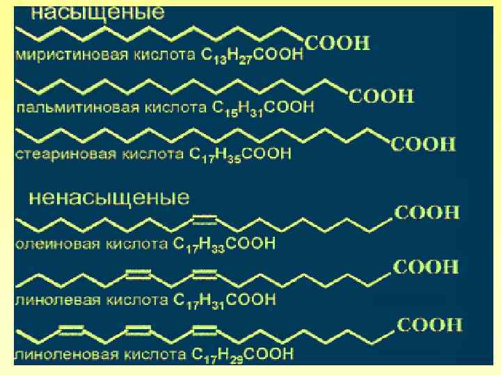 ЖИРЫ животные растительные Твердые Жидкие (искл. рыбий жир) (искл. Кокосовое масло) Образованы предельными кислотами С 15 Н 31 СООН пальмитиновая С 17 Н 35 СООН стеариновая Образованы Непредельными кислотами С 17 Н 33 СООН олеиновая С 17 Н 29 СООН линолевая