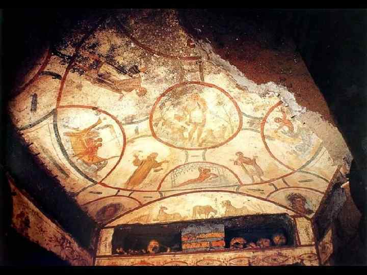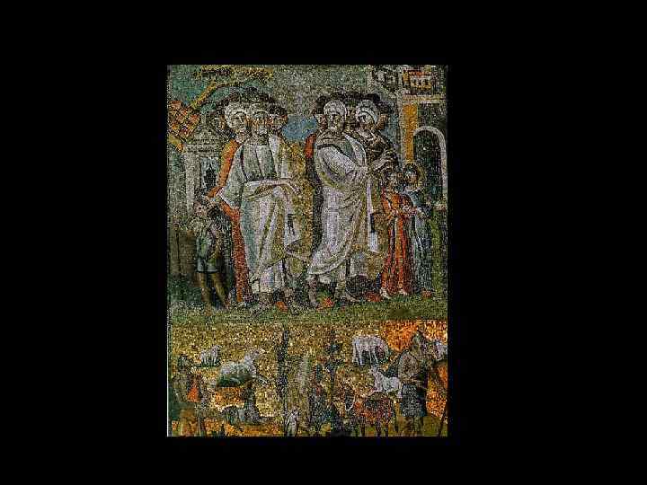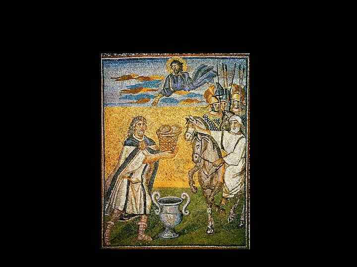 Cаркофаг Юния Басса, 359 г. Верхний ряд 1) Жертвоприношение Авраама. 2) Арест Св. Петра 3)Иисус на троне со св. Петром и Св. Павлом. 4 -5) Иисус перед Понтием Пилатом. Нижний ряд 1) В поте лица своего буешь есть хлеб свой. 2) Адам и Ева. 3) Вход Господень в Иерусалим 4) Даниил во рву Львином. 5) Св. Павла ведут на Мучениество.
