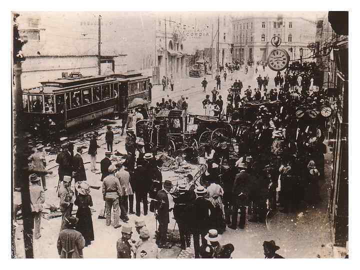 Первая неудача • В 10: 10 Чабринович бросил гранату в автомобиль эрцгерцога, но та отскочила и взорвалась на дороге. Взрывом было ранено около 20 человек. Сразу после этого Чабринович проглотил капсулу с ядом и пригнул в реку.