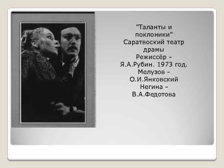 "Таланты и поклоники" Саратвоский театр драмы Режиссёр Я. А. Рубин. 1973 год. Мелузов О. И. Янковский Негина В. А. Федотова