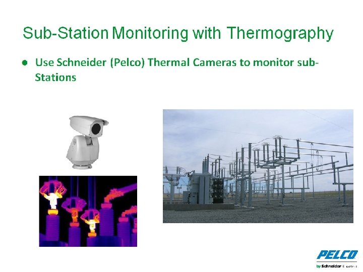 Electrical Substations Cost Effective Perimeter Security Predictive Maintenance ● Continuous thermal monitoring: 1. Make repairs early before problems spread and while less costly. 2. Prevent expensive downtime due to equipment failures ● Power industry has well documented ROI for thermographic inspections