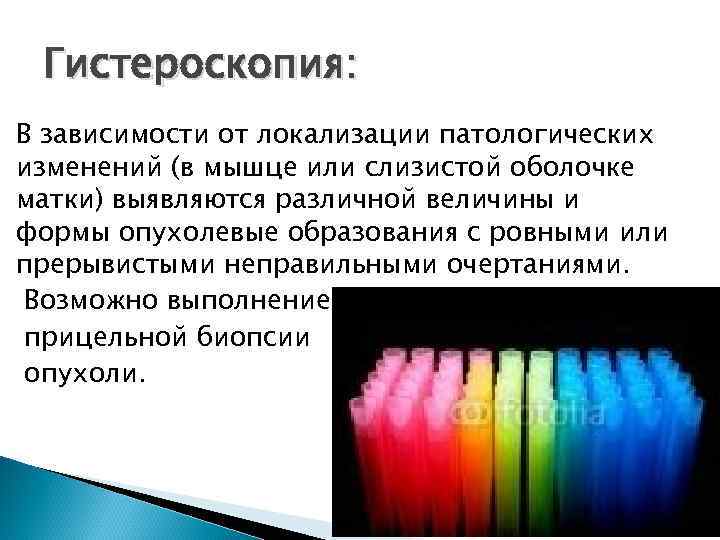 Гистероскопия: В зависимости от локализации патологических изменений (в мышце или слизистой оболочке матки) выявляются различной величины и формы опухолевые образования с ровными или прерывистыми неправильными очертаниями. Возможно выполнение прицельной биопсии опухоли.