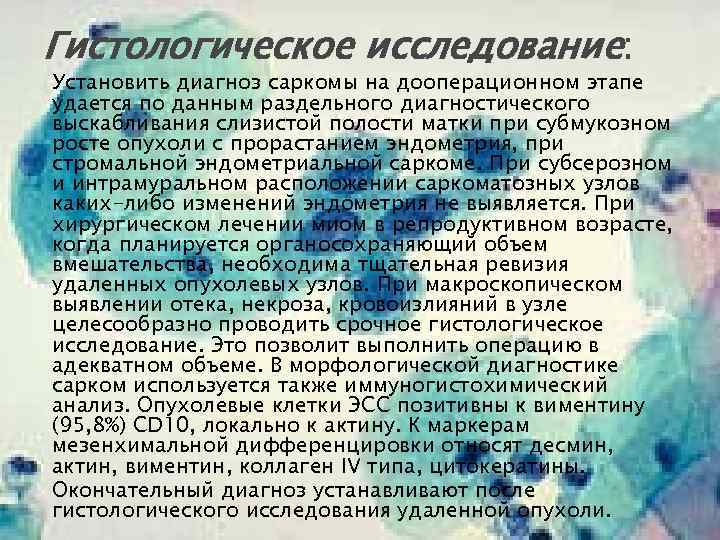 Гистологическое исследование: Установить диагноз саркомы на дооперационном этапе удается по данным раздельного диагностического выскабливания слизистой полости матки при субмукозном росте опухоли с прорастанием эндометрия, при стромальной эндометриальной саркоме. При субсерозном и интрамуральном расположении саркоматозных узлов каких-либо изменений эндометрия не выявляется. При хирургическом лечении миом в репродуктивном возрасте, когда планируется органосохраняющий объем вмешательства, необходима тщательная ревизия удаленных опухолевых узлов. При макроскопическом выявлении отека, некроза, кровоизлияний в узле целесообразно проводить срочное гистологическое исследование. Это позволит выполнить операцию в адекватном объеме. В морфологической диагностике сарком используется также иммуногистохимический анализ. Опухолевые клетки ЭСС позитивны к виментину (95, 8%) CD 10, локально к актину. К маркерам мезенхимальной дифференцировки относят десмин, актин, виментин, коллаген IV типа, цитокератины. Окончательный диагноз устанавливают после гистологического исследования удаленной опухоли.
