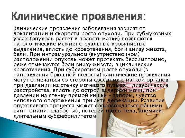 Клинические проявления: Клинические проявления заболевания зависят от локализации и скорости роста опухоли. При субмукозных узлах (опухоль растет в полость матки) появляются патологические межменструальные кровянистые выделения, вплоть до кровотечения, боли внизу живота, бели. При интрамуральном (внутристеночном) расположении опухоль может протекать бессимптомно, реже отмечаются боли внизу живота, ациклические кровотечения. При субсерозном росте опухоли (в направлении брюшной полости) клинические проявления могут отмечаться со стороны соседних с маткой органов: при давлении на стенку мочевого пузыря – дизурические расстройства, вплоть до острой задержки мочи, при давлении на стенку прямой кишки – запоры, чувство неполного опорожнения при акте дефекации. Развитие опухолевого процесса может сопровождаться общими симптомами: слабостью, потерей массы тела, анемией, длительным субфебрилитетом.