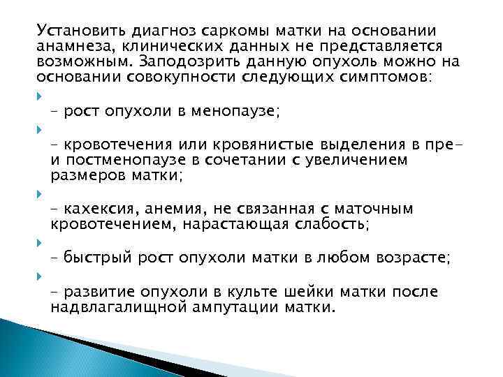 Установить диагноз саркомы матки на основании анамнеза, клинических данных не представляется возможным. Заподозрить данную опухоль можно на основании cовокупности следующих симптомов: – рост опухоли в менопаузе; – кровотечения или кровянистые выделения в преи постменопаузе в сочетании с увеличением размеров матки; – кахексия, анемия, не связанная с маточным кровотечением, нарастающая слабость; – быстрый рост опухоли матки в любом возрасте; – развитие опухоли в культе шейки матки после надвлагалищной ампутации матки.