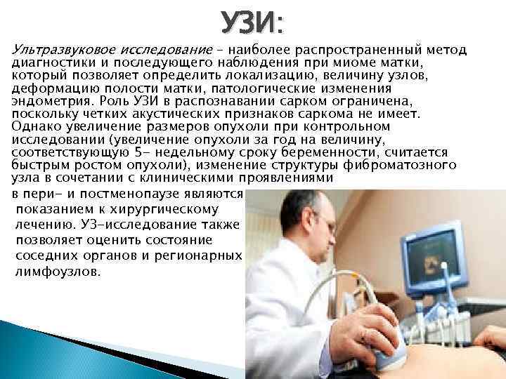 УЗИ: Ультразвуковое исследование – наиболее распространенный метод диагностики и последующего наблюдения при миоме матки, который позволяет определить локализацию, величину узлов, деформацию полости матки, патологические изменения эндометрия. Роль УЗИ в распознавании сарком ограничена, поскольку четких акустических признаков саркома не имеет. Однако увеличение размеров опухоли при контрольном исследовании (увеличение опухоли за год на величину, соответствующую 5 - недельному сроку беременности, считается быстрым ростом опухоли), изменение структуры фиброматозного узла в сочетании с клиническими проявлениями в пери- и постменопаузе являются показанием к хирургическому лечению. УЗ-исследование также позволяет оценить состояние соседних органов и регионарных лимфоузлов.