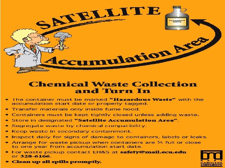 § Ensure that wastes are properly packaged and labeled. § § Containers with residues, cracked lids, damaged containers, unknowns, or leaking containers will not be collected, and will be left in the lab. Complete the waste pick-up request form from EH&S web page and email to safety@ecu. edu. Provide your name, phone #, location, identity, and amounts of waste. Waste pick-ups are conducted every Thursday.
