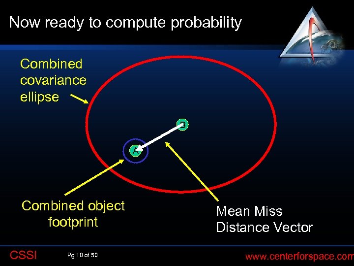 Now ready to compute probability Q Combined covariance ellipse B A Combined object footprint CSSI Pg 10 of 50 Mean Miss Distance Vector www. centerforspace. com