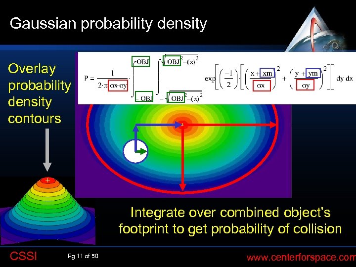 Gaussian probability density Q + Overlay probability density contours + Integrate over combined object’s footprint to get probability of collision CSSI Pg 11 of 50 www. centerforspace. com
