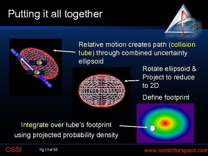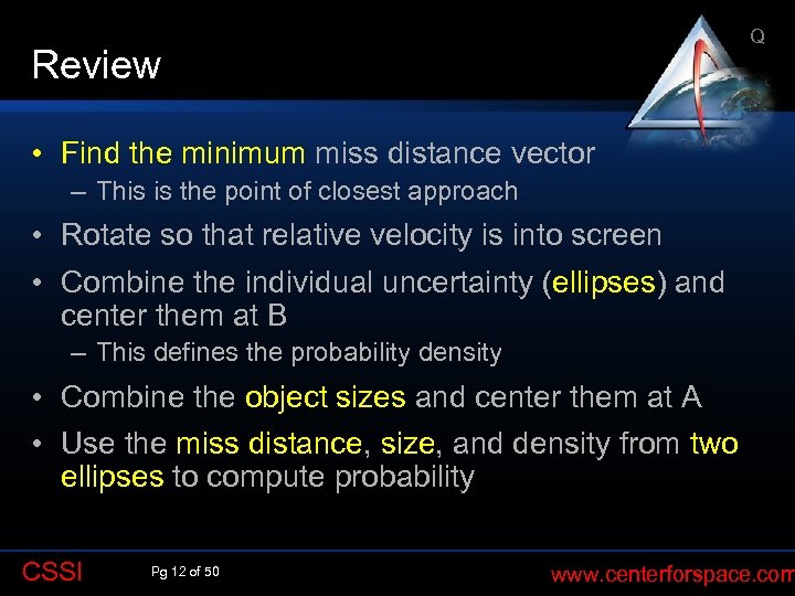 Q Review • Find the minimum miss distance vector – This is the point of closest approach • Rotate so that relative velocity is into screen • Combine the individual uncertainty (ellipses) and center them at B – This defines the probability density • Combine the object sizes and center them at A • Use the miss distance, size, and density from two ellipses to compute probability CSSI Pg 12 of 50 www. centerforspace. com