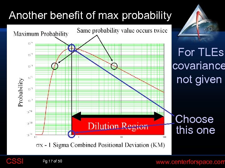 Another benefit of max probability Q For TLEs covariance not given Choose this one CSSI Pg 17 of 50 www. centerforspace. com