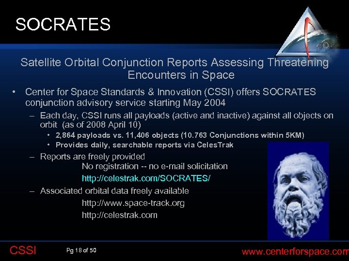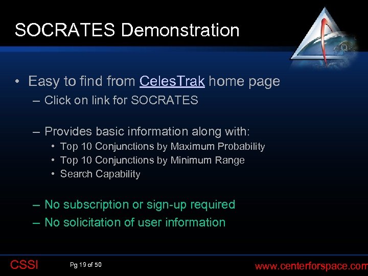 SOCRATES Q Satellite Orbital Conjunction Reports Assessing Threatening Encounters in Space • Center for Space Standards & Innovation (CSSI) offers SOCRATES conjunction advisory service starting May 2004 – Each day, CSSI runs all payloads (active and inactive) against all objects on orbit (as of 2008 April 10) • 2, 864 payloads vs. 11, 406 objects (10. 763 Conjunctions within 5 KM) • Provides daily, searchable reports via Celes. Trak – Reports are freely provided No registration -- no e-mail solicitation http: //celestrak. com/SOCRATES/ – Associated orbital data freely available http: //www. space-track. org http: //celestrak. com CSSI Pg 18 of 50 www. centerforspace. com